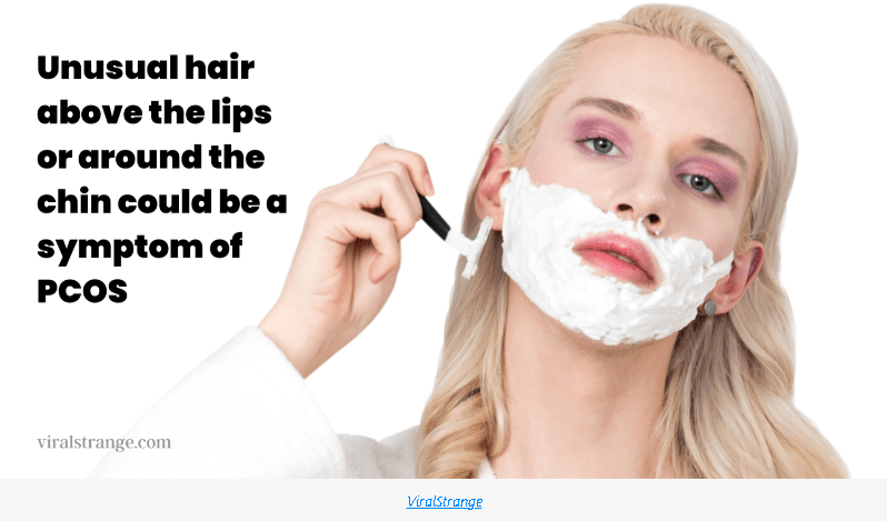 Unusual hair growth around the chin or above the lips can be a symptom of PCOS (polycystic ovary syndrome: when ovaries grow because of a hormonal imbalance.