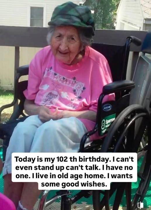 She sat quietly in her wheelchair near the window of the old age home, her fragile hands folded neatly on her lap, trembling slightly from age and time. At 102 years old, her voice had grown too weak to speak more than a few soft whispers, and her legs no longer had the strength to carry the woman who once ran through fields, danced barefoot on warm summer nights, and carried children in her arms with endless love.