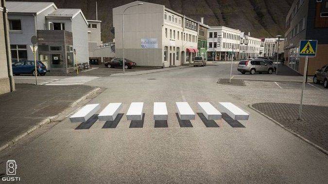 9. “This optical illusion on a pedestrian crossing in Iceland to oblige cars to brake”