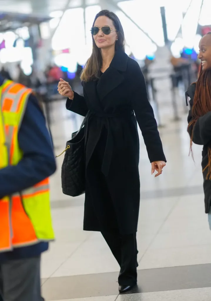 Angelina exuded a stylish aura in a long black coat reaching above her calves, paired with black pants and a brown shoulder bag. Her long hair flowed over her shoulders, and her gaze was shielded behind a pair of sleek glasses.