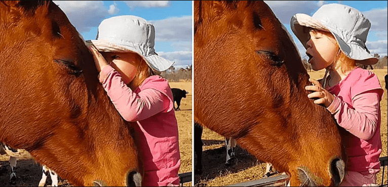 “Myf,” a three-year-old, has a natural affinity towards horses. All this tiny horse whisperer has to do is climb a nearby post and begin singing.