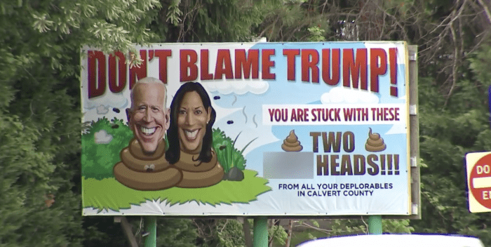 A “vulgar” billboard posted in Maryland paints President Joe Biden and Vice President Kamala Harris in a negative light. The billboard, which includes cartoon caricatures of the president and VP, is posted in Huntington in Calvert County along Route 4 and Bowie Shop Road. The sign features the images of the president and vice president in piles of cartoon feces along with the pro-Trump message that reads, “DON’T BLAME TRUMP! YOU ARE STUCK WITH THESE TWO (expletive) HEADS!!!”