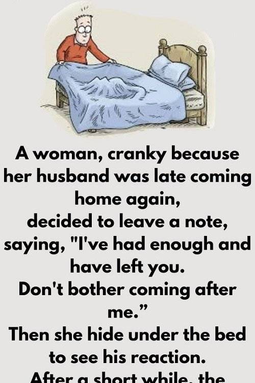 A woman, cranky because her husband was late coming home again,decided to leave a note, saying, “I’ve had enough and have left you.