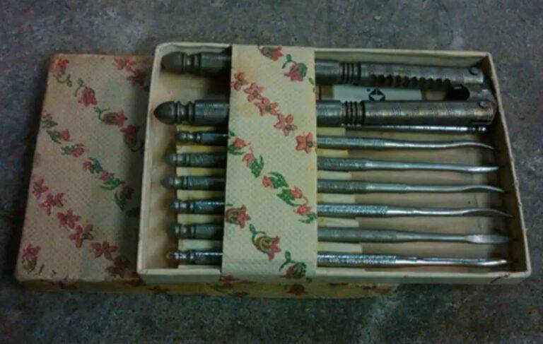 The metal sticks are actually nutcrackers! Likely from the 1940’s or 1950’s, this type of nutcracker would be used to dig the actual nut out of a shell.They help to get to the edible portion of any nut, but are especially common to help one properly eat a chestnut.
