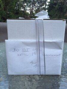 “As my Great Uncle Bill would say, ‘Nothing is ever so bad that it couldn’t get worse,’” Kathy said. So, for nearly 9 years and 3 moves, the box sat high on a shelf in their various closets, gathering dust. But, sitting on their deck and discussing their friend’s upcoming wedding, Kathy and Brandon decided it was time to open the box.