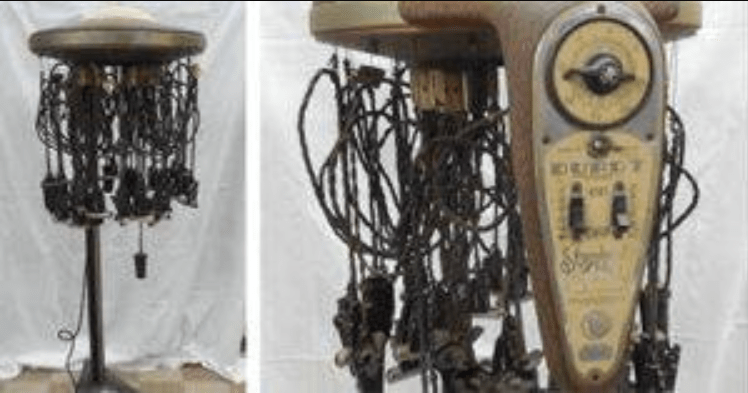 It’s actually a popular item that was used in most businesses and some homes. The machine in question has a circular part on top with cords that are attached. There are small items added to the cords.