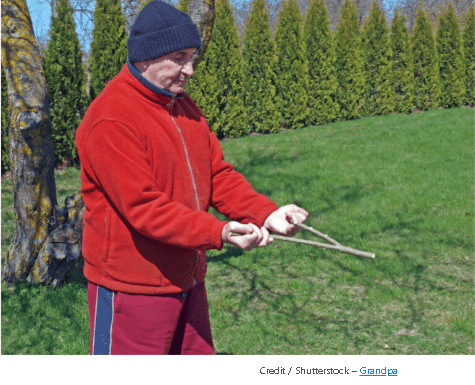 An individual would hold both branches of the stick in each hand, palms facing upwards. The stem of the V (the bottom bit where the two rods meet) is then titled toward the Earth at a 45-degree angle.