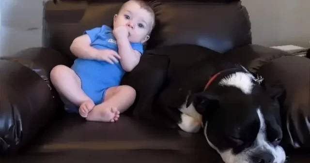 The adorable dog, Max, is lying next to the baby, but the second he hears the tiny guy just pooped his pants, his reaction is priceless! I really couldn’t stop laughing at what he did, but I did feel sorry for Max!