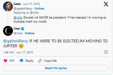 And Cher, tweeted, “IF HE WERE TO BE ELECTED, IM MOVING TO JUPITER.”
