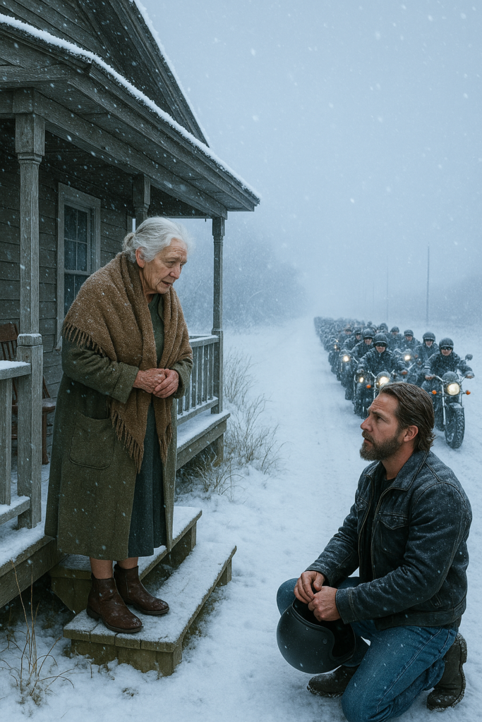Days later, her quiet farmhouse roared with engines again. This time, far more than fifteen. Dozens of bikers filled her driveway, their motorcycles lined up in precise formation. Jack approached with a solemn expression and thanked her for her kindness. He explained that word of her generosity had spread through their community, and they wanted to show their gratitude. They spent the afternoon clearing snow from her roof, stacking firewood, and repairing her fence.