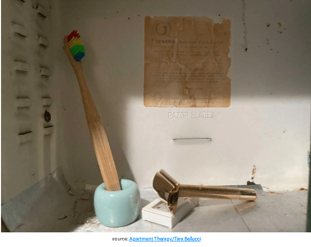 The razor blades would just accumulate in the empty gap behind the wall. So if you’ve ever renovated an old home before and opened up a wall, only to find a pile of used razor blades behind it, this is why! Though this seems so peculiar to think about now, at the time, I can totally see why this design feature would be practical!