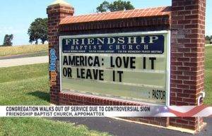 The Appomattox pastor unveiled his latest declaration on the message board, which read “America: love it or leave it” in bold letters. The unmistakable message was posted directly outside the church building for all to see. Of course, Lucas’ bold stance didn’t come without swift consequences.
