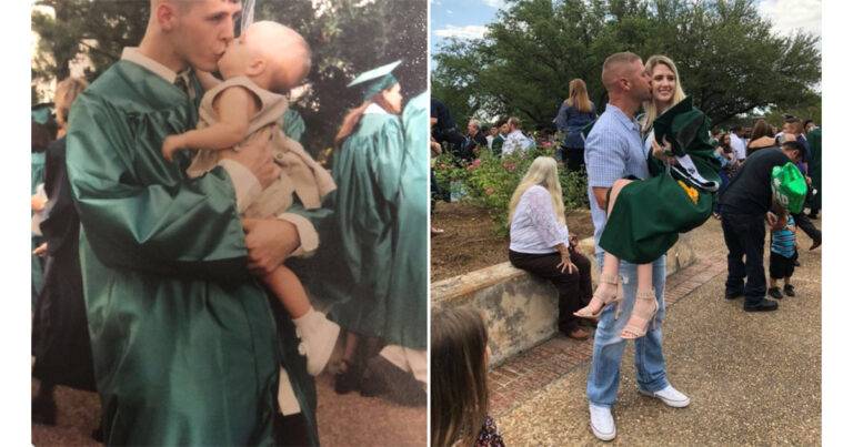 Those positive feelings must have been ten-fold for Texas dad Dennis Roach in 2018, as his daughter’s high-school graduation gave him the opportunity to recreate a photo taken back in 2000 – and the result was enough to warm hearts all over the world…When Dennis graduated high school in 2000, he was lucky enough to have his infant daughter, Tori, present for the celebrations. At the time, the pair posed for a photo in which Dennis gave his little girl a kiss – the perfect keepsake reminder of his big day.