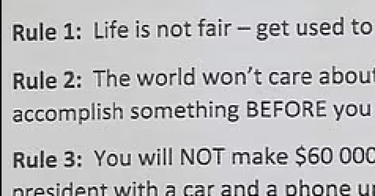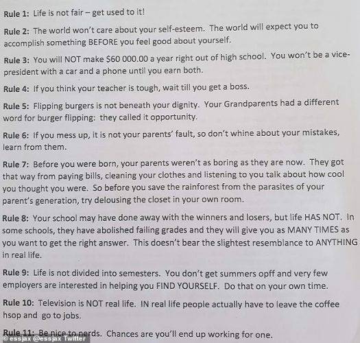 The letter has been circulating the internet for years and has been attributed to both Bill Gates and Steve Jobs by some people. However, social media users were appalled that the boss would hand this out to young workers on their first day on the job.