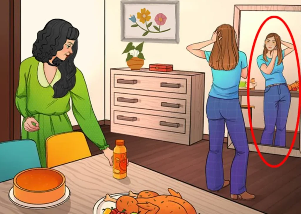 While there’s a girl placing a bottle on the dining table, a large turkey being served, and another girl admiring herself in the mirror, don’t let these distractions mislead you.