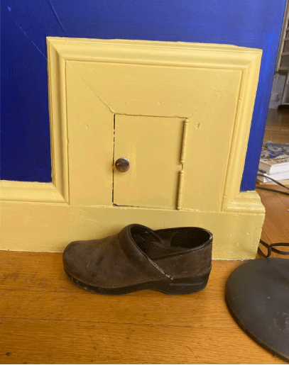 but can’t find the backside of the tiny door! it’s painted over, and feels very secure- almost locked. this house has a complex laundry chute system but this seems way too small to be a part of it.