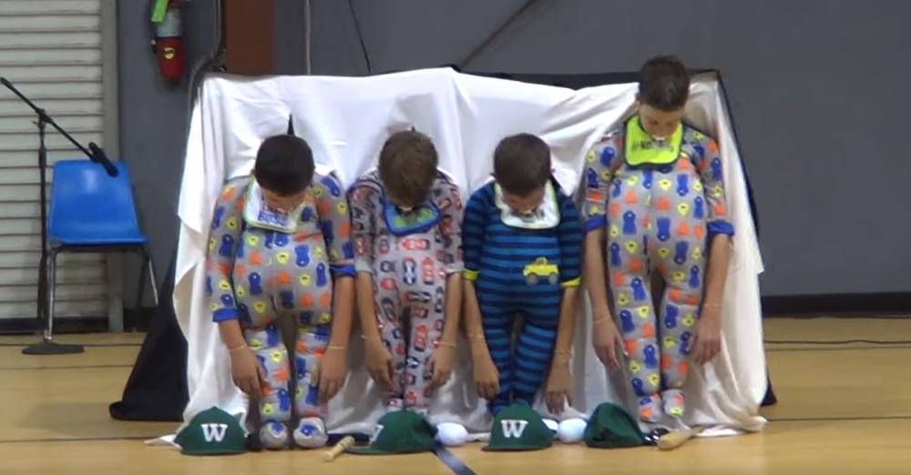 Four 5th graders dress in onesies, when they raise their heads the crowd erupts in laughter