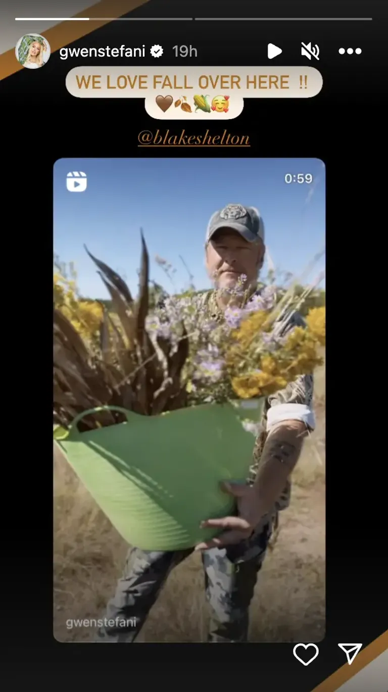 Stefani shared a video of her and Shelton harvesting pumpkins and gathering natural decorations for the fall season. The fashion designer was seen in a sun hat, a white vest, loose navy pants, and cowboy boots.
