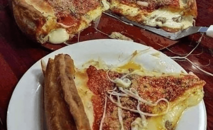 Cover the lowest aspects of a 12-inch cake pan with melted butter. Using your hands, spread approximately three-quarters of the dough throughout the lowest and top aspects of the pan (reserve the rest for any other use). Cover the lowest of the mozzarella to the edge. Cover 1\/2 with a thin, even layer of raw sausage. Cover the opposite 1\/2 with pepperoni. Put a handful of mashed tomatoes on the pinnacle. Spread with hands to the edge. Sprinkle over with grated Parm.