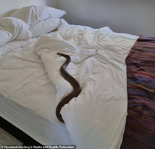 Zachery snapped photos of the snake lounging on the bedding, with the snake appearing both above and below the comforter as though it were taking a daytime nap. Someone wrote on social media that they would “burn the bedding” after having seen the snake on the bed, just knowing that the animal was there for a single second.