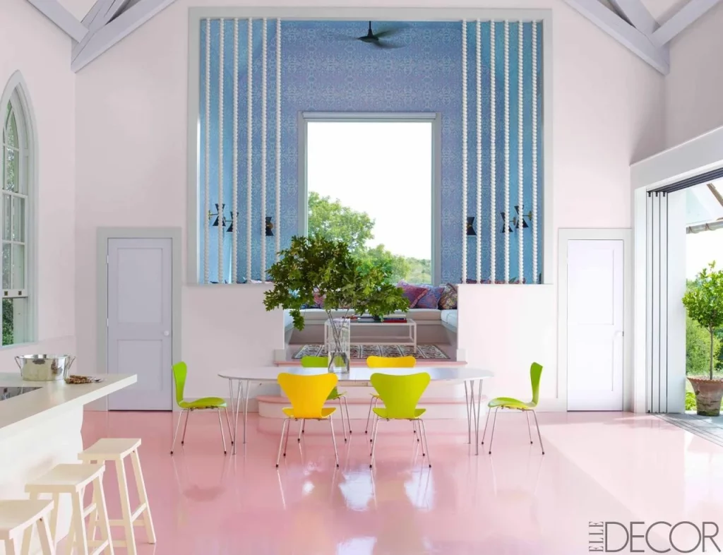 Haselberg worked with creative consultant Nancy Kintisch to incorporate striking hues and unusual design features throughout the room, such as the baby pink lacquered floors and the lavender-painted ceiling. The interior, with its skillfully hidden amenities and roomy built-in sofa, exudes a whimsical sophistication that is typified by its basic yet amusing design.