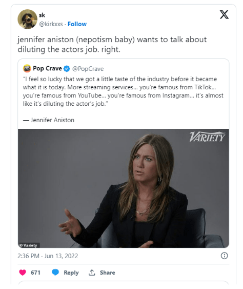 Some people wanted to draw attention to Aniston’s affluence as well as her claim to control Hollywood and fame. relating it to how greatly the social media sites TikTok and Instagram have levelled the playing field.