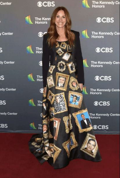 Julia Roberts made a striking statement at the Kennedy Center Honors event in Washington, DC, by wearing a custom-designed gown covered in photos of her close friend, George Clooney.