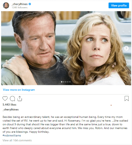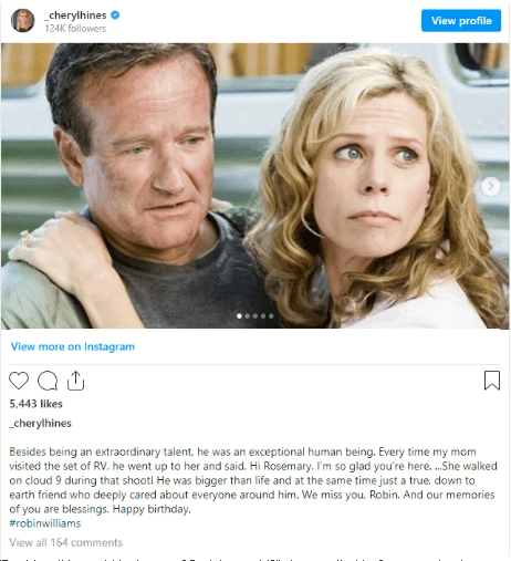During her time on Curb, Cheryl, who was awarded a star on the Hollywood Walk of Fame in 2014, worked on various initiatives. She has acted alongside the late Robin Williams in a number of movies, including the road comedy RV.