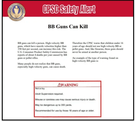 CPSC Safety Alert clearly states a pellet gun is not a toy, even though that’s what many outlets reported the suspect as having. (Photo Credit: CPSC Safety Alert)