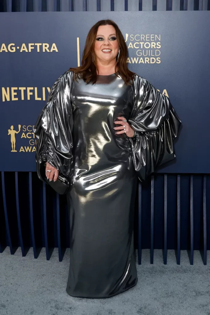 Melissa McCarthy, 53, recently showcased a striking look that captivated public attention at this year’s SAG Awards. For her attire, she adorned a figure-hugging, long silver metallic dress complete with ruched puffed sleeves, which she paired with white and silver rings, silver earrings, and a matching silver purse.