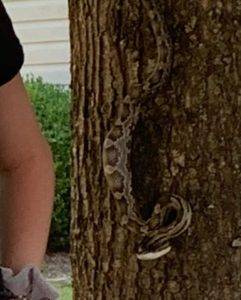 The snake, apparently freshly fed, blended in perfectly with the bark and could barely be seen. It was not immediately identifiable. Commenters have labeled it as a rat snake on the Facebook post of the event.