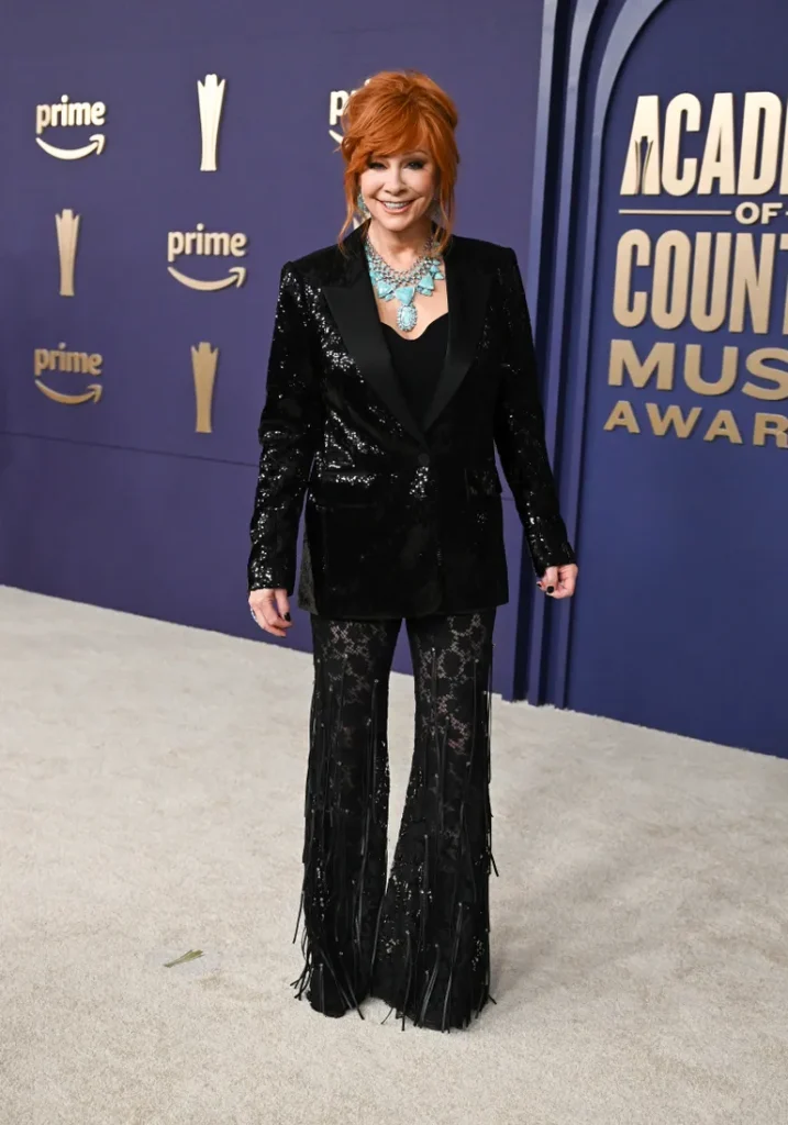 Reba McEntire flaunted a glamorous look at the event, showcasing her eye-catching red hair. Dressed in a sequinned blazer paired with fringed flared pants and turquoise accessories, McEntire certainly made a bold statement.