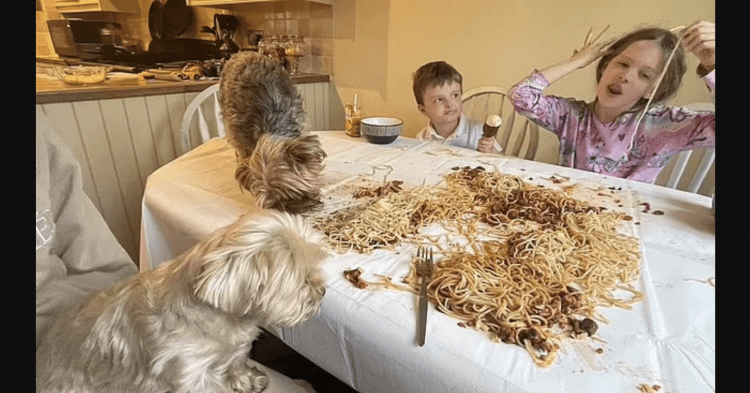 Hannah, with a mischievous twinkle in her eye, explained that tonight’s dinner would be a “fun dinner.” What followed was a delightful departure from the norms of family dining. Willow and Oakley abandoned their knives and forks and dug into the pasta with their hands, giggling all the way. The family’s three Yorkshire Terriers, no doubt enticed by the aroma, couldn’t resist joining in the culinary adventure, clambering onto the table to partake in the unusual meal. It was a heartwarming scene of joy and togetherness.