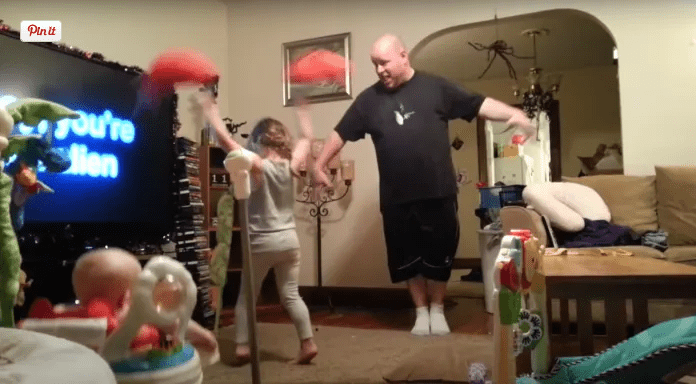 It doesn’t take long for the dad to leave the chores and join his daughter, doing the robot dance and a ballet, surprising light on his feet for his large frame.