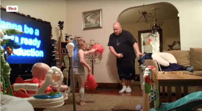 As the daughter keeps dancing around with pom poms, the dad breaks out diva-esque moves, hand on his hips. The dance gains momentum, and he even bends down to involve the baby, sticking his tongue out and jumping up and down.