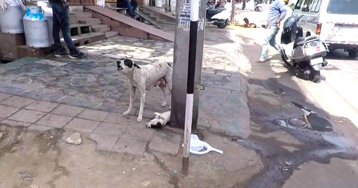 The dog stood guard and guarded her little puppy. But somehow, this clever mother knew they were there to help her, so she trusted them completely.