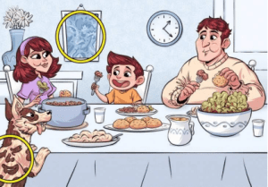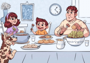 In this picture, there’s a family of three having lunch at a table. There’s a clock showing that it’s