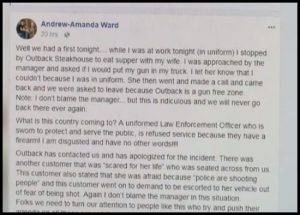 The manager walked away, made a phone call, then returned and asked both Ward and his wife to leave. The manager said that Outback Steakhouses are “gun-free zones.” Officer Ward went on to further explain the situation. “I don’t blame the manager… but this is ridiculous and we will never go back there ever again,” Ward said on Facebook. “A uniformed Law Enforcement Officer who is sworn to protect and serve the public, is refused service because they have a firearm! I am disgusted and have no other words!!!”