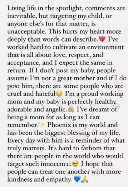 Addressing the situation further on her Instagram Story, Hilton expressed that although she expects comments as a public figure, targeting her child or anyone else’s is “unacceptable” and deeply hurtful. She shared her disappointment, explaining how she has worked hard to create an environment of love, respect, and acceptance, and hopes for the same in return.