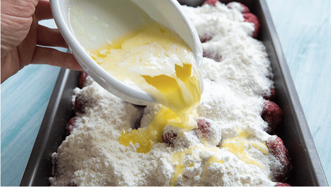 Pour melted butter on strawberries. The end result is a 3-ingredients dessert that will make you drool