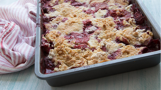 When you take it out of the oven, the cake should be golden, and the fruit should bubble