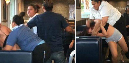 As Erika Chavolla storms toward Sabrinah Fontelar, the customer picks up a tray and hits the employee in the head with it, but she barely notices. Chavolla then grabs the customer by the hair and begins raining punches down on her head and face. Being much larger than her opponent, she picks Fontelar up and throws her over a nearby table as other employees run over to try and break up the fight.