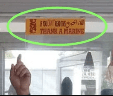 The bumper sticker went viral after a customer shared a picture of the restaurant saying it was “absolutely disgusting.” The restaurant owner has since refused to remove the controversial bumper sticker.The sticker displays the message, “If you can’t read this, thank a Marine,” and has additional text in Arabic that says “Allahu akbar.”