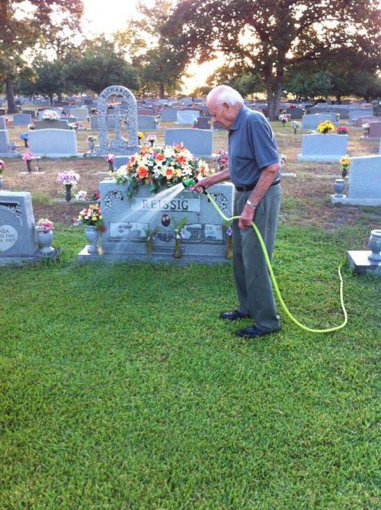 “It’s been over a year now since Mom left us to go to her Heavenly home,” Roger wrote in a Facebook post, letting the world know what his father had done. “Dad goes out to the grave to visit her twice a day. He has a routine where he clips some roses from his rose garden at home and delivers them to Mom. Then, he hooks up a hose and waters her grass twice daily,” he explained, detailing his father’s amazing act of love toward his beloved wife.