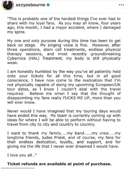 Ozzy’s European tour, which was first set to begin in May 2019, was later postponed to 2021 and 2022 before being canceled altogether.