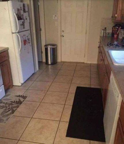 When I first examined this photo, I saw an empty kitchen. While it was filled with regular items like a stove, refrigerator, trash can, floor mats, and a sink, I didn’t notice anything out of the ordinary. However, this image came to us from a dog owner who loves sharing snaps of his pooch. But the picture is deceptive because this is not just a blank kitchen with nothing in it – there’s a dog in the picture right in front of your eyes.
