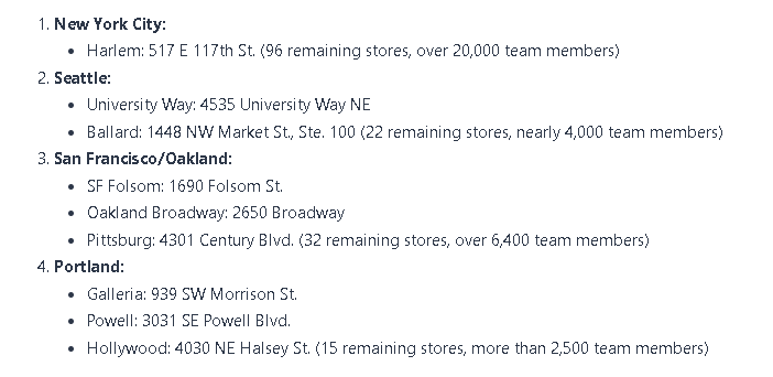 Despite “adding more security team members, using third-party guard services, and implementing theft-deterrent tools,” the challenges with crime persisted. Below are the affected markets along with the remaining stores and employment data: