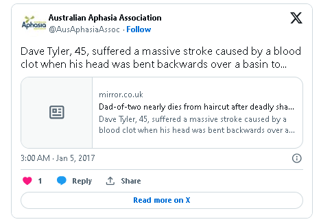 Please be careful when having your hair washed at the salon this is known as “beauty salon stroke syndrome” let others know of it.