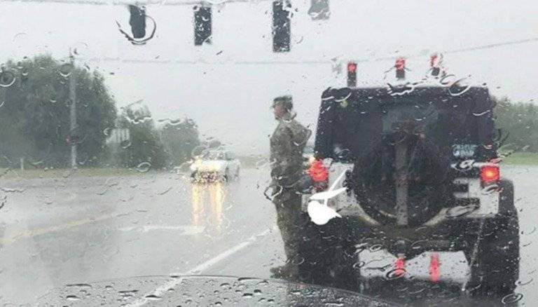 Hester wrote on her Facebook: “I was so completely touched by this today. A funeral procession was passing by and this soldier got out of his jeep to stand at attention in the pouring rain. I always get frustrated when I see cars that don’t pull to the side and stop for a procession, but this gentlemen went above and beyond.