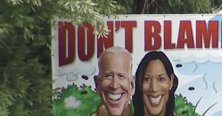 A “vulgar” billboard posted in Maryland paints President Joe Biden and Vice President Kamala Harris in a negative light. The billboard, which includes cartoon caricatures of the president and VP, is posted in Huntington in Calvert County along Route 4 and Bowie Shop Road. The sign features the images of the president and vice president in piles of cartoon feces along with the pro-Trump message that reads, “DON’T BLAME TRUMP! YOU ARE STUCK WITH THESE TWO (expletive) HEADS!!!”